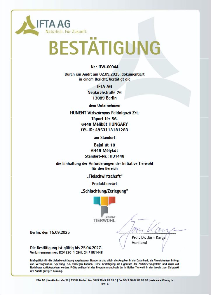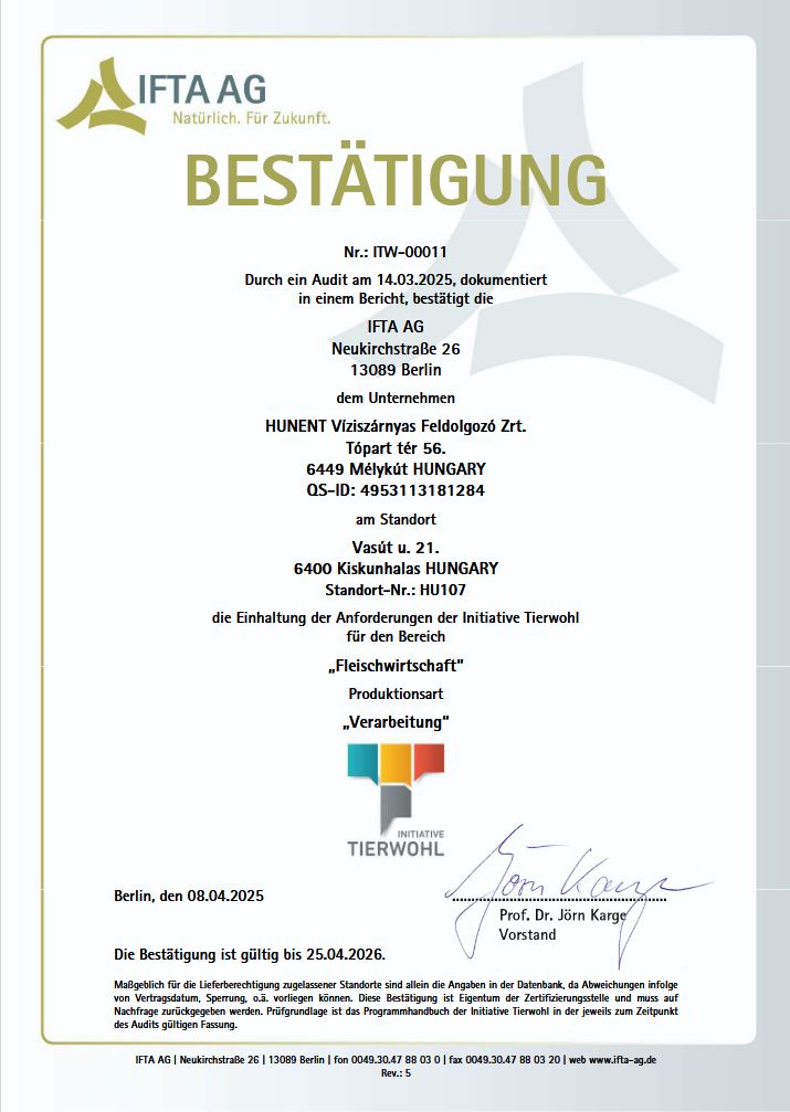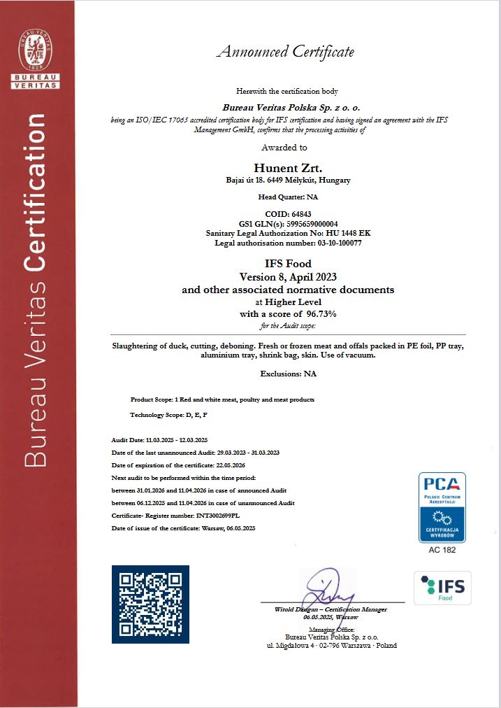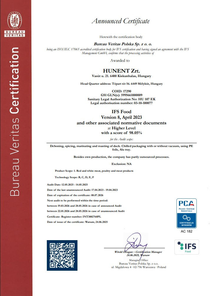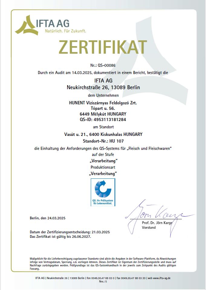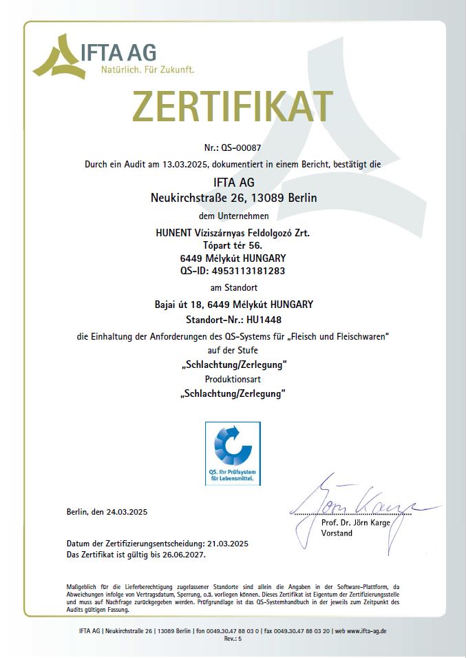 Cégünknél (HU 1448 EK, HU 107 EK) IFS 6.1. és QS szabvány alapján kialakított minőségirányítási rendszerek működnek.